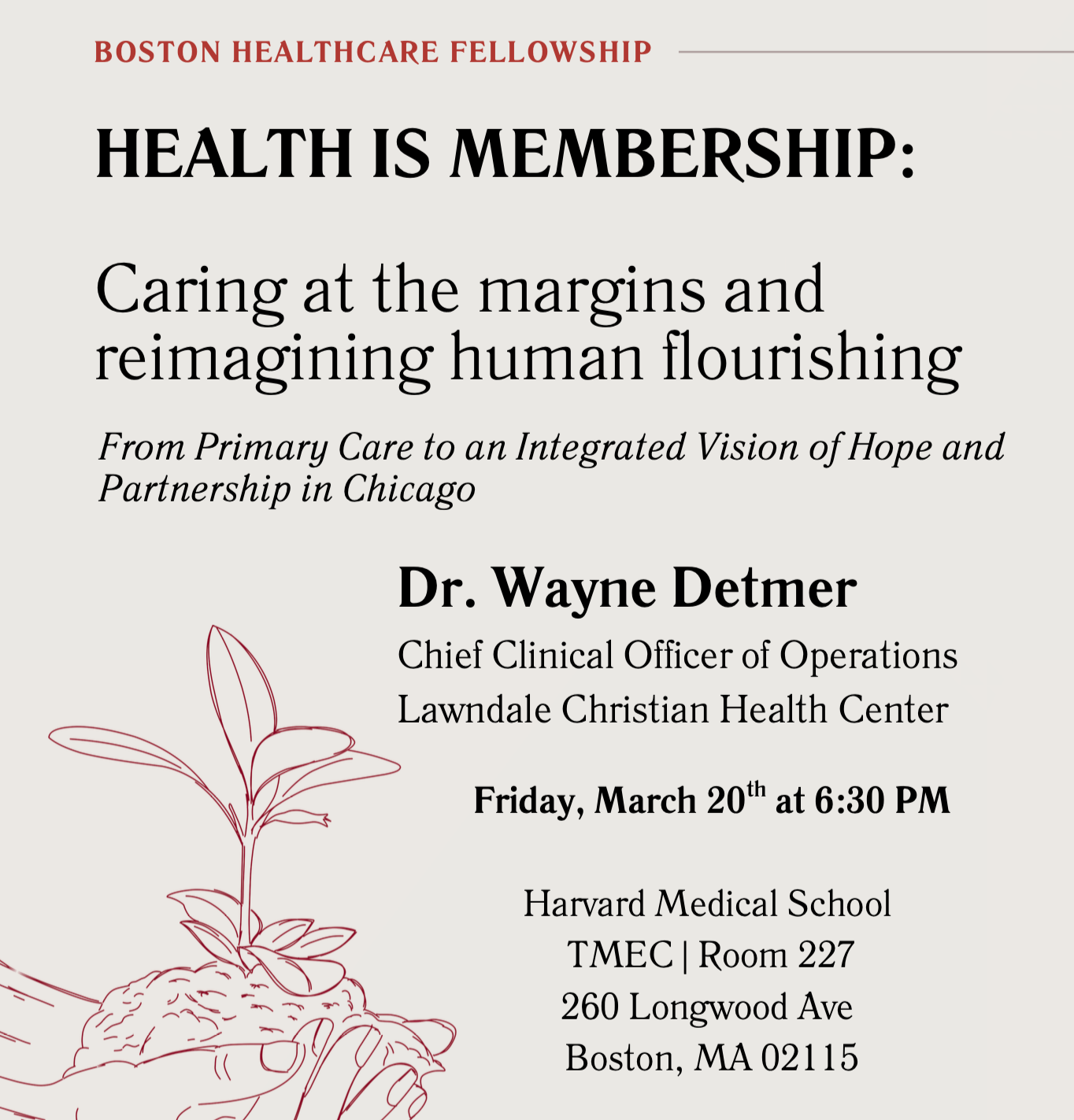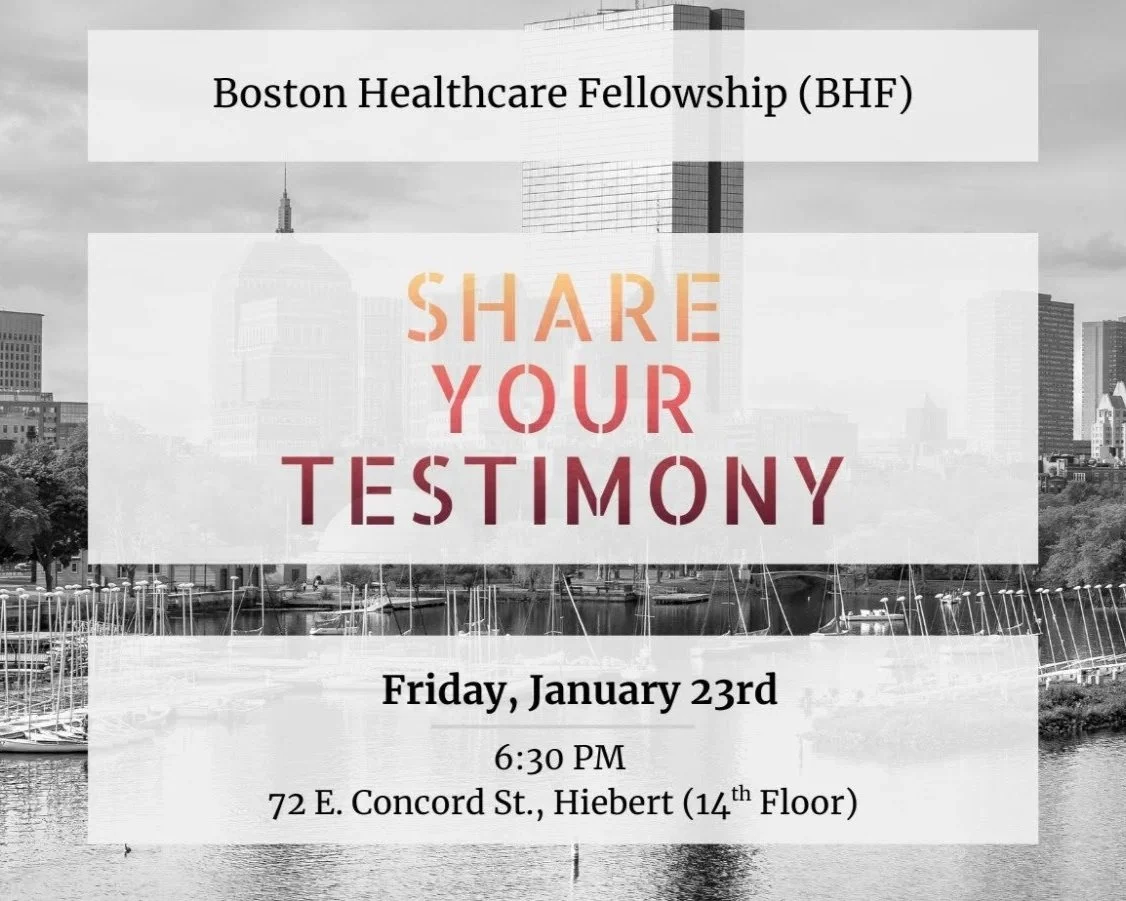 Our vision is to reunite faith and healthcare in line with God's intention of bringing healing to the world. To that end, we exist to bridge the worlds of academic healthcare and the church. We follow Jesus in the biomedical science and healthcare community in Boston for the glory of God and enable others to do the same.